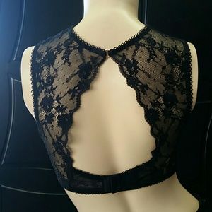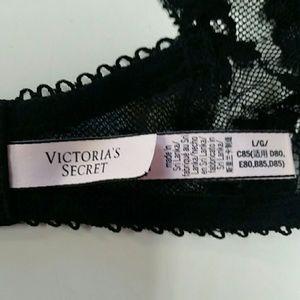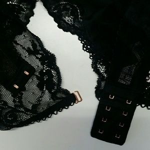 Victoria's Secret new without tags lace and velvet black bralette size large.Has rosegold clasps and hook and eye closures.I've asked several people the color of the velvet,and they agreed its almost totally black,but like a black green. It has no wear or pilling at all,quite well made. So cute and very sexy!NWOT!:)In the forth picture it looks like discoloration but I assure you its not,its just the photo!:)So cute under a cropped chunky knit sweater!