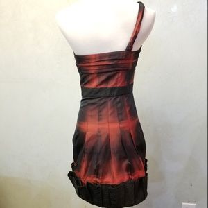 In perfect condition like new, BCBGMAXAZRIA off the shoulder tie-dyed off the shoulder dress with black ruffle overlay detail on the bottom. Side zipper with clasp. 100% Polyester with 100% acetate lining. has padding in the bust. The bust is 15in waist is 12in armpit down is 22in long.