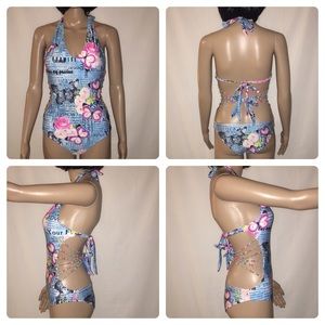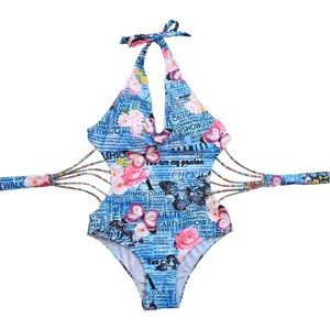 Sexy Floral Halter Strappy Back One Piece Swimsuit