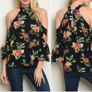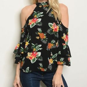 PINEAPPLE & FLORAL PRINT COLD SHOULDER TOP