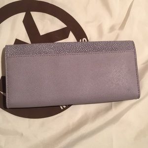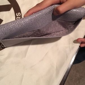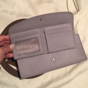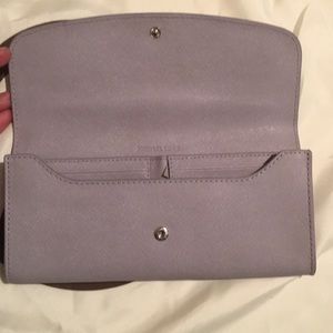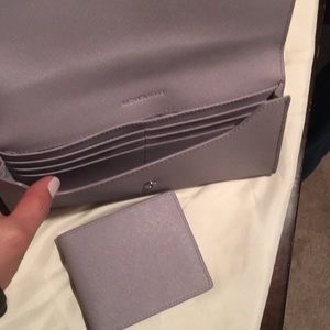 Michael Kors gray Leather Wallet, this Wallet includes a two fold smaller Wallet on the inside that is removable. Very good condition, with minimal signs of wear.