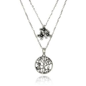 Two layered silver necklace featuring a lovely floral charm and a tree charm.