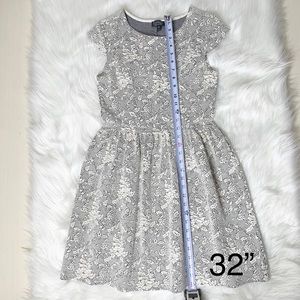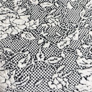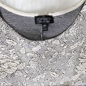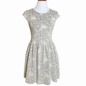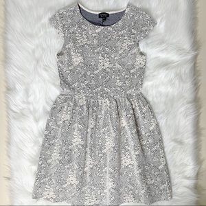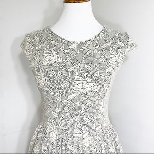 Topshop fit and flare knee length sheath dress. Ivory and black jacquard floral print. Quilted and textured soft stretch fabric. Cap sleeves, fitted on top, pleated waist with bubble flared skirt. No zipper, slips on. Great condition. Measurements in photos.