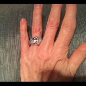 This beautiful Sterling Silver women’s ring features a large pear shaped, bezel set Blue Topaz and is also inlaid with light blue shades of Mother of Pearl.