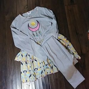 EUC 2 piece DreanCatcher set by Ann Loren. Cute ruffle details. We loved thia but only got to wear a few times bwfore we outgrew. This hasnt shrunk but I feel it runs a size small. This is a size 13/14 but I think it fits More like a size 11/12. Any questions pls ask.