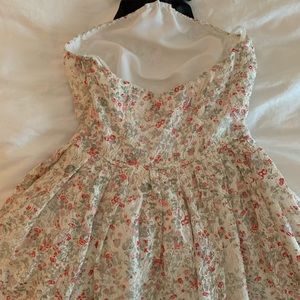 Rare and adorable dress made of printed lace over lining. Black satin halter with adjustable closure around neck. Elastic in back makes for a beautiful fit without sagging or gaps. Perfect for dressy events or a fun outing. Preloved and admired. EUC. Approx measurements laying flat: waist 13” (26” around), bust 32”-34” (has elastic around back that stretches it).
