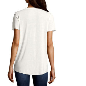 This Off White Criss Cross tunic style Tee features a front screen of the Aerosmith World Tour 1982 Poster on it. Raw finish sleeves and rounded hem. Show your passion for Aerosmith with this fine T-shirt. 65% Polyester,35% Rayon.
