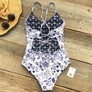 Two looks in one! This printed swimsuit is reversible!! Open style backside with fun crisscross lace up strappy detail.
