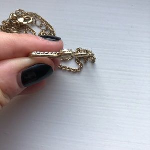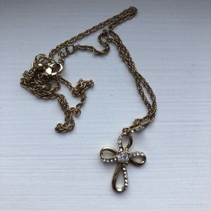 Vintage gold tone metal cross pendant necklace. The necklace is comprised of a thin & dainty gold tone chain that measures 21 inches long (including a 3.5 inch extender) & has a lobster claw enclosure. The necklace has a gold tone looped cross pendant on it. The pendant measures 1.5 inches by .85 inches & has a faux solitaire diamond in the middle of it and is enhanced with rhinestones. Some normal wear with use over time, but in good vintage condition!