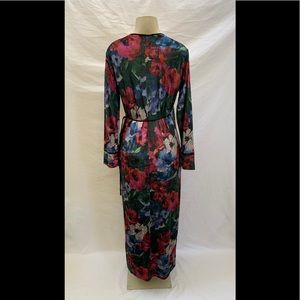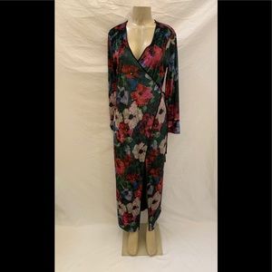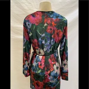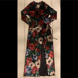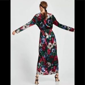 NWT Zara Size Medium Green With Multi-Color Floral Print Velvet Kimono Maxi Wrap Dress (92% Polyester & 8% Elastane). See Below For Measurements!