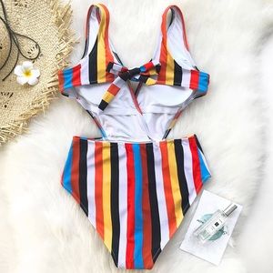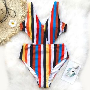 Bold and never boring. This one piece monokini swimsuit features a plunging neckline and ties at the back for adjustable support. The bold colors are bright and on trend for a beachside look that can be dressed up or down.