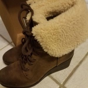 UGGS Brown Oiled Leather W ZEA , size 9M waterproof fur boots, hardly any wear, with 2 1/2" wedge heel