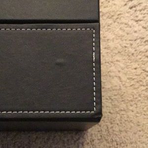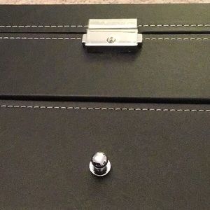 20 Slot Two-story jewelry and watch case. Removable sleeves for bracelets or watches. Key included.Never used. Glass viewing top to display your fabulous jewelry. Slight flaw (last picture). Not noticeable when case setting flat.