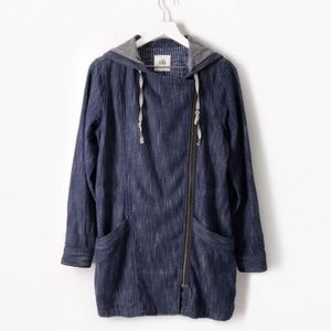 -Features full zip, moto style collar, pockets, long length sleeves, chambray denim like material, hood, drawstring waist, limited edition Love, Carol collection
