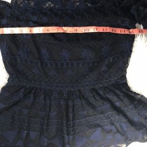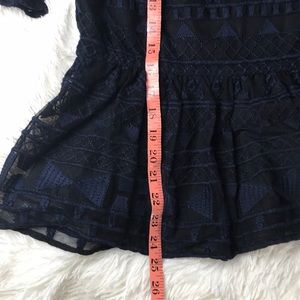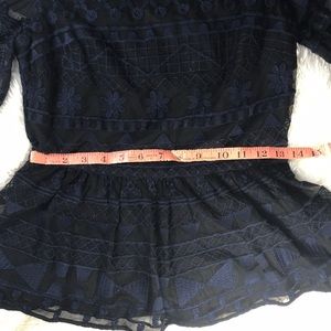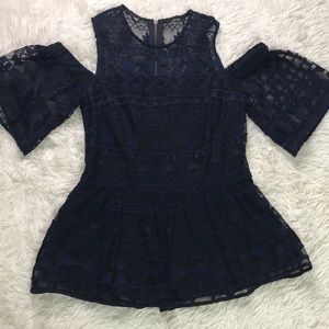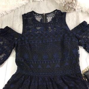 Parker Cold-Shoulder Illusion Top in navy and black, navy lace with black lining underneath, peplum waist and zippered back, super flattering and feminine, perfect for a night out!