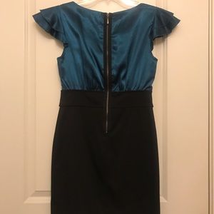 Super cute with black heels and a statement necklace! This teal and black business casual dress is knee length. The black part of the dress is a very stretchy spandex material. The dress does have an exposed zipper as seen in the last picture