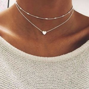 Silver Heart Choker Double Chain Necklace