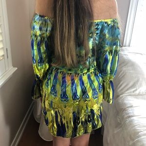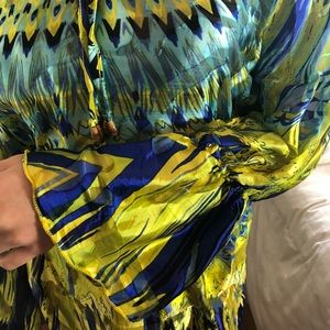 Incredibly soft, tie front with wood beads, bell sleeves & love the rich green, yellow & blue boho colors! Perfect for your go to daily wear. Would look awesome with cute cowboy boots for a boho flair. This is my photo/model, actual item shown. USA sizes. Birthday Anniversary gift present. Vacation Vegas cruise trip wedding pageant poolside beach lounging date night festival spring summer fall winter dress cover up girls night out
