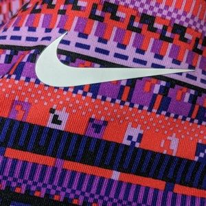 Purple/Pink/Black/Orange Aztec Design Dri-Fit Pullover by Nike. Features front half zip and thumb holes for maximum movement and warmth while running. Made of 88% Polyester and 12% Spandex.