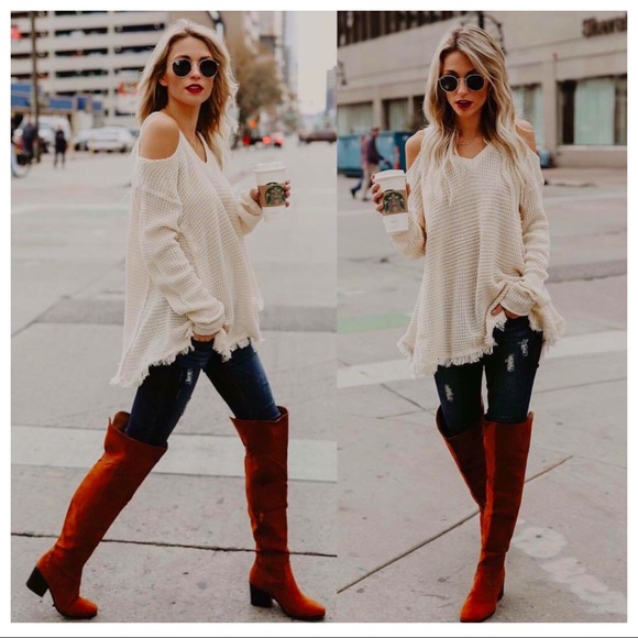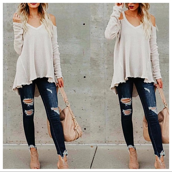 This time in white! This gorgeous popular heavy sweater with peek a boo shoulders is stunning! Sold out of black twice already!