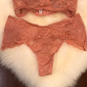 Fun, flirty and still great for every day wear, this Victoria’s Secret peachy coral lined demo bra and thigh set is part of the Dream Angels collection. Intricate detail on the front and from behind on the panty so you can make an impression coming and going. Size 32B comes with matching panty in size XS and size 32D, 34B, 34C and 34D bras each comes with matching panty in size Small. Color and style no longer found in stores. No trades but offers welcome!