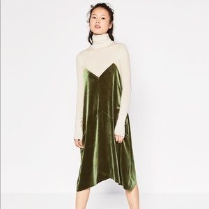 Zara spaghetti strap dress. Color is a dark green and is suede like material. In perfect condition. Approximate measurements. Ptp:16” Length: 43” strap included