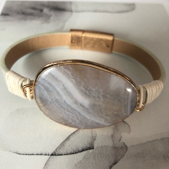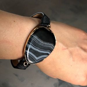 New with tags / NWT Black Lace Agate + Leather magnetic Bracelet. Genuine black leather, cord wrap detailing, and bezel set black lace stone agate focal piece. Gold magnetic clasp detailing. Each bracelet is unique because of the natural stone. Also available in neutral white ivory. Ship with pretty backing card.