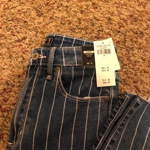 Brand new never worn still with tags and still in packaging white stripe high rise ankle jeans from Abercrombie & Fitch. The jeans come in size 26 (2) regular and are from the Simone high rise line. The Simone line features A&F’s high rise skinny jean with figure-defining style and built-in stretch for superior comfort. This jean sits at the waist and looks great with your shirt tucked or untucked. Pinstripe pattern and raw hem. Materials: 94% cotton, 5% polyester, and 1% elastane.