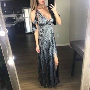 Make an impact at your next special event in our foil maxi dress. This floor-sweeping style is cut with a plunging front and is finished with a cold-shoulder sleeve detail. Cold shoulder, Side Slit