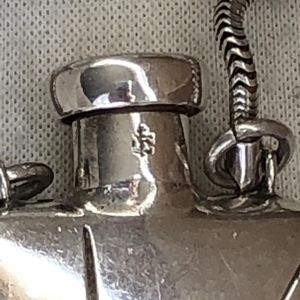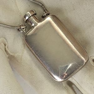 Gorgeous, vintage solid Artisan made sterling silver and 14k gold perfume decanter pendant necklace - About 1-3/4” tall by 1” - Etched sunshine design on front - Marked sterling and what might have been 14k but can’t tell however the yellow sun tested as 14k gold - Hangs from a nice vintage 24” snake style sterling silver chain - Does show some surface scratches and has not been cleaned nor polished however overall very good condition -