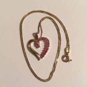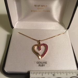 Beautiful heart shaped ruby & 18 Karat gold over sterling silver necklace. Chain is 17” in length and box chain style. 12 genuine rubies. This beauty was hard to catch in pictures. See pictures for additional measurements. Comes in gift box.