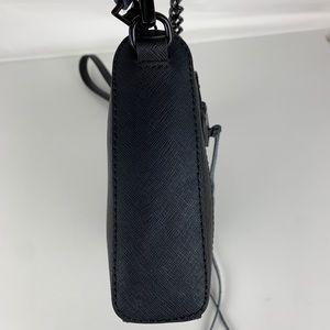 Black Saffiano leather and black hardware. 23” strap drop - chain and leather. Zip top closure. Open inside pockets. 9”W x 6”H d 1.5”D. RB5305