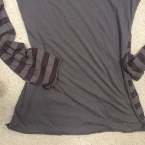 Very soft, lightweight jersey long sleeve tee, sleeves and back are striped in a darker grey (overall tone of this shirt reads really subtle lilac to me, but it is closest to gray). Shoulders have a delicate lace overlay, sexy, comfy and great for transition seasons or summer layering! Missing size tag, but measurements fit a true Medium. Gently used, reflected in price.