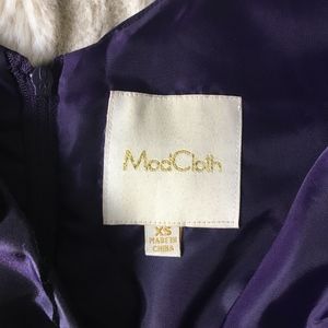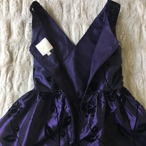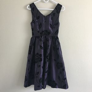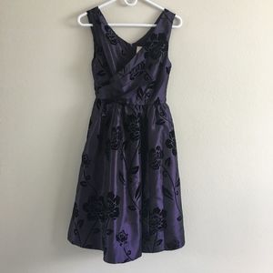 This fit and flare dress is so glamorous and comfortable! It is a beautiful plum color with velvet flowers on it. It is part of the ModCloth namesake label, and it has features that you'll love, such as pockets, a zip-back closure, a pleated surplice neckline, and velvety black bouquets. Only worn once, in great condition!