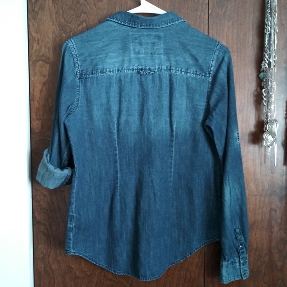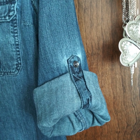 My fave denim top ever! It's actually quite dark denim and it's more fitted, see the stitching on the back. I can provide measurements! Slightly distressed but you can still tuck in with dress pants or a dress skirt for work! Tab sleeves as an option, EUC, tts XS since its pretty fitted but not tight. So versatile!