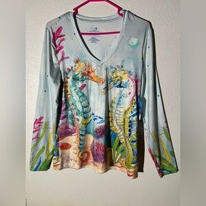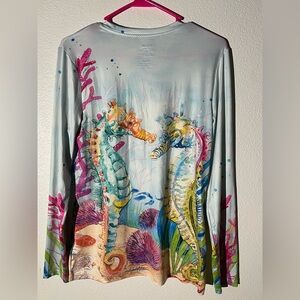 Local Florida Artist. Great colors. Seahorse design on front and back. Breathable, lightweight, Quick Dry. Long sleeve. V neck. Size Small. Brand New with Tags