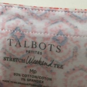 Talbots petite medium cotton spandex stretch tee. Decorative cut to shoulder. Colors of royal blue, orange and white.