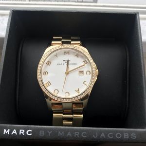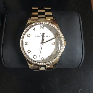 Gold Marc Jacobs watch comes with the original box & instruction booklet, the two links that were removed to fit my wrist, and the tag (detached). In excellent condition but needs a new battery. Open to offers and comment if you have questions.
