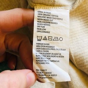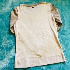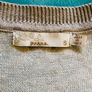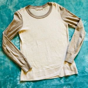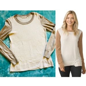 Gorgeous cream knit crew neck sweater with tan sleeves and neckline trim. Diagonal detail on lower front left. Metal prAna brand tag stitched on back neck area.