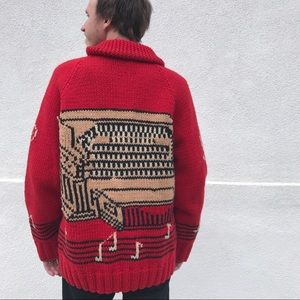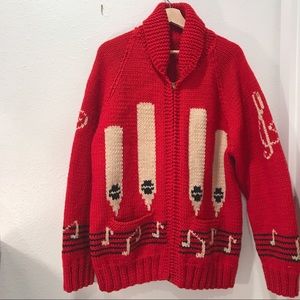 Music-themed red knit oversized sweater. Handmade / no tags. Features treble cleft designs on arms, music notes on bar, and organ on bag. Bust: 44” Length: 28” Sleeve: 30”. 9/10 vintage condition.