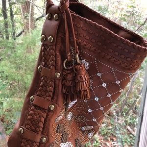 Beautiful brown leather handbag with beading and embroidery . Very intricate.
