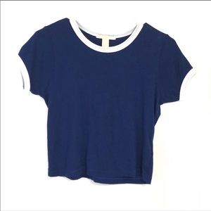 Forever 21 short half sleeve navy blue crop top with white trim on neck line - crew neck