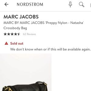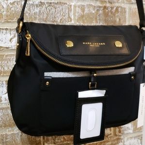 Marc Jacobs Preppy Natasha Crossbody Bag. Black. Nylon. Gold hardware. Adjustable shoulder strap. Flap with snap closure and zipper to hidden flap pocket. Interior zip pocket, cell phone/multifunction pockets. Front Logo patch and front slip pocket.