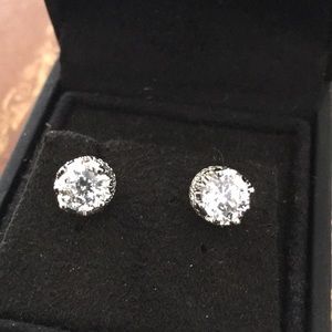 Very sparkly (3.5 cttw) stud earrings in platinum plated sterling silver featuring cubic zirconia round in antiqued crown setting. Imported.