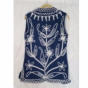 This is a beautiful sleeveless piece that has come in handy on many tropical vacations abroad. The color of the blue teal married with white embroidery is exquisite. A statement piece that can be worn with shorts, white linen pants or skirt. This is a well loved piece, that has some wear to it - but also much life associated with it too!!