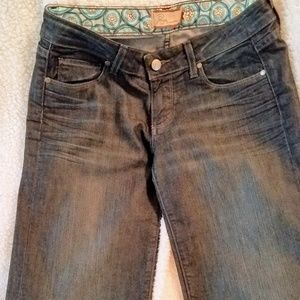 "Byron" style dark wash with whispering around the front pockets. Perfect condition. Waist: 15" Rise: 7.5" Inseam: 32" Leg Opening:11.5". 99% Cotton 2% spandex.