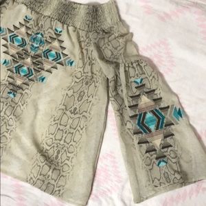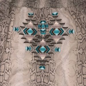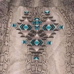 Judith March cream snakeskin blouse with turquoise tribal markings on front as well as Belk sleeves. Very classy and very cool. Also very flattering. I love this blouse and it’s killing me to post it! Lol!