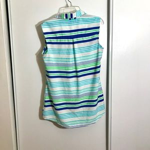 Beautiful Merona s/p stripped sleeveless button up sleeveless shirt. Excellent condition. No flaws. Worn only a couple of times. 100% polyester. Length 28. Pit to pit 17.