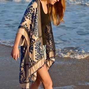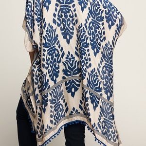 This super chic wear-with-anything pattern kimono is the perfect accent to your Spring wardrobe. The rich print and pom pom hem adds that special uniqueness to this piece. Color: Sand, royal Blue and black 100% Viscose Hand Wash