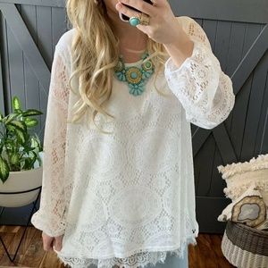 Beautiful Bohemian Blouse. This pretty top features a soft white lace base, long sleeve and feminine flowy body. Lined body.